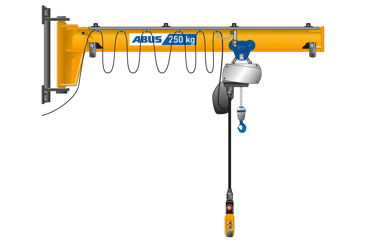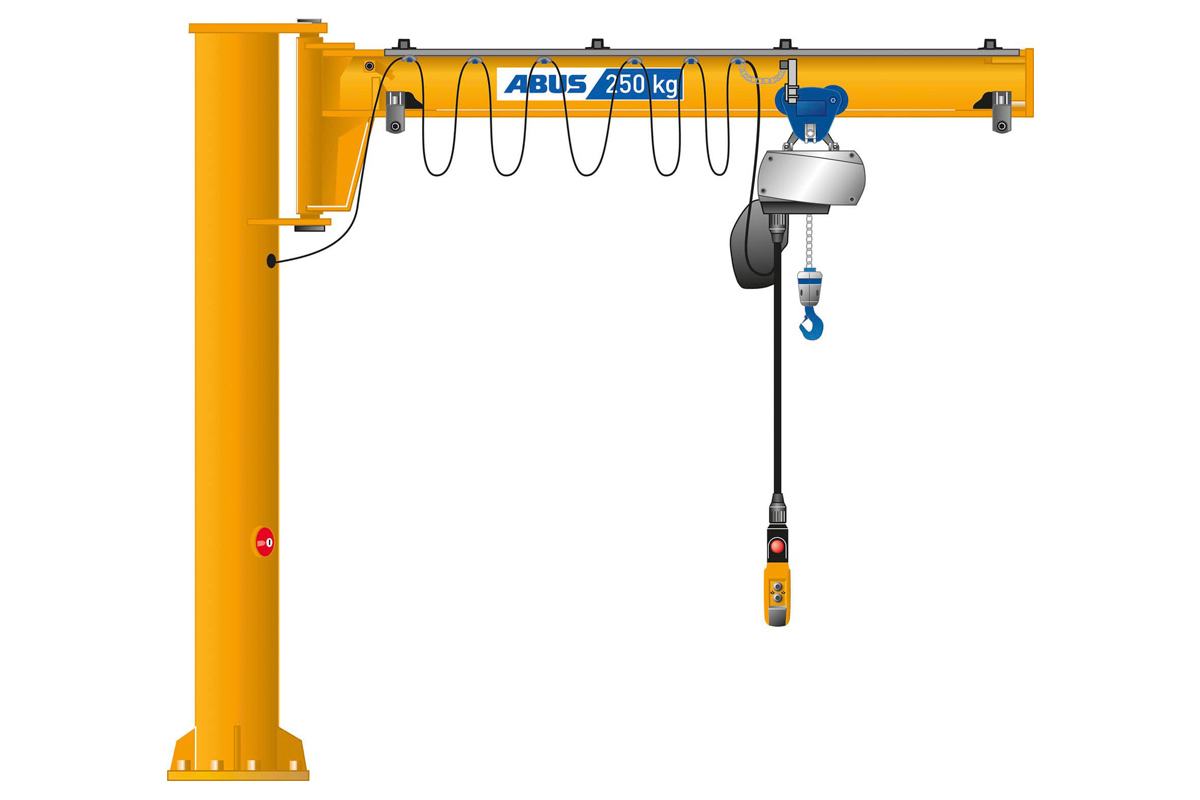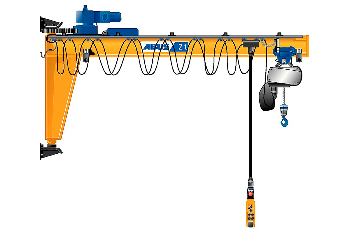 На иллюстрации показан кран с электрическим поворотным механизмом, электрической тележкой и дистанционным управлением.