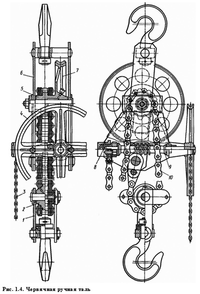 Червячная таль с пластинчатой грузовой цепью, образующей двукратный полиспаст, имеет (рис. 1 .4) верхнюю обойму 6, в которой размещен приводной механизм, и крюковую подвеску / с подвижной звездочкой 2, подвешенной на пластинчатой шарнирной цепи 10. Приводной механизм состоит из червяка 9, на котором закреплена приводная звездочка 4 с калиброванной сварной бесконечной цепью 3, и из червячного колеса 7, выполненного литьем со звездочкой 5 или жестко соединенного с ней. Звездочка приводит в движение грузовую пластинчатую цепь, от длины которой зависит высота подъема груза. Червячная передача для увеличения КПД выполнена несамотормозящейся с двухзаходным червяком с углом подъема винтовой линии 15 — 20°. Поэтому для предотвращения самопроизвольного опускания груза она имеет дисковый грузоупорный тормоз 5. Грузоподъемность червячных талей составляет 0,5—10 т, а КПД —0,55—0,7.