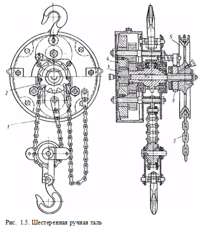 Шестеренная ручная таль показана на рис. 1.5. Крутящий момент тали от тягового колеса 5 передается на приводной вал с шестерней 3, находящейся в зацеплении с двумя зубчатыми колесами 4, и далее через еще одну зубчатую передачу — на звездочку 2, осуществляющую привод грузовой пластинчатой цепи.