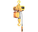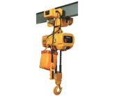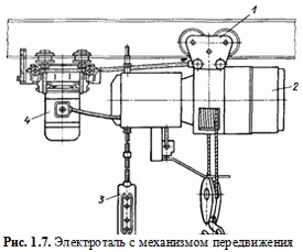 Электрическая таль (тельфер с электрическим приводом). Отличительным признаком электроталей является компактность. Электротали подвешивают к неподвижным опорам (балкам, колоннам, стенам и т. д.) с помощью болтов или крюков или к тележкам, перемещающимся по монорельсовому пути. Управление механизмом подъема электротали производят с пола с помощью двухкнопочного поста управления, подвешенного к тали. Токоподвод выполнен в виде троллей или гибкого кабеля. Грузоподъемность электроталей составляет 0,1—15 т. Высота и скорость подъема груза соответственно не более 30 м и 0,05—0,15 м/с. При необходимости (например, при выполнении монтажных работ) электротали кроме основной скорости подъема могут иметь еще дополнительную, так называемую «посадочную» скорость, которая может быть в несколько раз меньше основной скорости. Электротельфер может быть использован в качестве самостоятельной грузоподъемной машины или в качестве механизма подъема в более сложных машинах (монорельсовых тележках, мостовых однобалочных кранах, настенных консольных кранах и т. д.). Большинство электроталей имеют в качестве гибкого грузового элемента стальной канат и реже сварную или пластинчатую цепь. Конструкции канатных электроталей весьма разнообразны, причем различаются они между собой взаимным расположением барабана и электродвигателя. По этому признаку электротали разделяют с фланцевым двигателем, установленным на одной оси с барабаном, с двигателем, встроенным в барабан, и с параллельным расположением двигателя и барабана.
