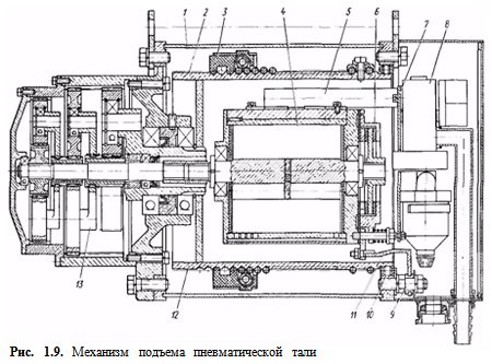Механизм подъема пневматической тали, показанный на рис. 1.9, имеет корпус I, пневматический ротационный лопастной двигатель 4 с встроенным дисковым тормозом 6, соосный трехступенчатый планетарный редуктор 13, барабан 2 с канатоукладчиком 3 и блок аппаратуры управления 8. Для уменьшения габарита тали пневмодвигатель с тормозом располагают в полости барабана. Одной опорой двигателя является выходной вал, который опирается на входной вал редуктора. Другой опорой двигателя служит кронштейн 11, который с одной стороны прикреплен к заднему фланцу двигателя, а с другой — к корпусу тали с помощью упругих втулок 9. Сжатый воздух к двигателю подается через коллектор 5.