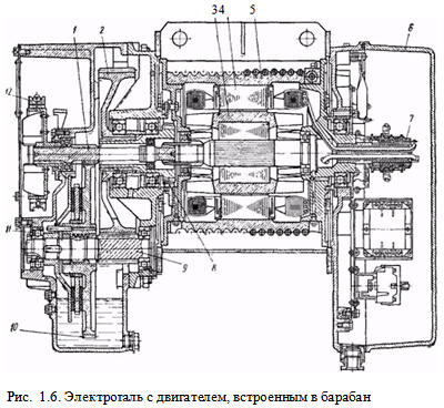 Электротали с двигателем, встроенным в барабан (рис. 1.6), серии ТЭ имеют грузоподъемность 0,5; 1; 2; 3,2; 5; 8; 12,5 и 16 т.