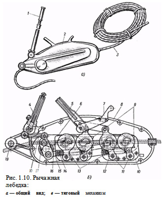 Рычажная ручная лебедка (рис. 1.10, а, б) выполнена без органа навивки каната. Принцип работы ее основан на протягивании каната через тяговый механизм с помощью двух пар зажимов. Лебедка имеет тяговый механизм 2 для каната 3 и телескопический рычаг /. Тяговый механизм (рис. 1.10, б) имеет корпус 8, рукоятки переднего 4 и заднего 5 хода, штырь 19, с помощью которого лебедка прикрепляется к анкерному (якорному) устройству, рассчитанному на увеличенное в 2 раза расчетное натяжение рабочего каната, переднего б и заднего 10 захватов, рычага 7, предназначенного для освобождения каната от зажимов. Каждый захват состоит из двух щек, внутри которых расположены два зажима 9, осуществляющие захват каната, пружин 14, серьги с одним ушком 13 и серьги с двумя ушками 12. Каждая серьга, состоящая из двух пластин, имеет фигурные отверстия в виде полуокружностей, в которые входят фигурные выступы зажимов (сухарей) 9. Зажимы имеют полукруглую канавку для протягиваемого каната. Усилие, зажимающее канат, создается пружинами 14, которые сжимаются между щеками зажима с одной стороны и правой серьгой соответствующего захвата с другой стороны. При повороте каждой серьги вокруг собственной оси 11 при движении по часовой стрелке вследствие давления серег на фигурные выступы зажимов происходит зажим каната, а при повороте серег против движения часовой стрелки происходит сжатие пружин и освобождение каната. Оба захвата с помощью тяг и рычагов соединены с рукояткой переднего хода. |