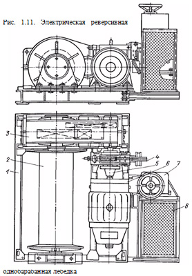 Реверсивная однобарабанная лебедка смонтирована на раме /. Привод осуществляется от асинхронного двигателя с фазным ротором 6. Барабан 2 с редуктором 3 соединен с помощью зубчатой муфты внутри барабана. Двигатель с редуктором соединен упругой разъемной муфтой 5, одна из частей которой (со стороны редуктора) используется в качестве тормозного шкива. Тормоз 4 двухколодочный с короткоходовым магнитом переменного тока. Управление электродвигателем производится контроллером 7. На раме лебедки установлены также пускорегулирующие резисторы 8. Для опускания груза в электрических подъемных лебедках двигатель включается в сторону опускания груза. Если при этом момент от веса груза больше момента от сил трения в передачах лебедки, то двигатель работает в режиме генераторного торможения. Опускание груза реверсированием двигателя обеспечивает безопасность при работе лебедки. Строительно-монтажные однобарабанные лебедки должны иметь несколько скоростей подъема: малую скорость при посадке груза и большие скорости при подъеме и опускании груза. Наиболее часто их применяют с двухдвигательным приводом и планетарной муфтой или редуктором.