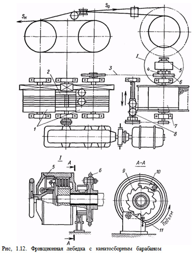 Для обеспечения большой высоты подъема груза или значительного пути перемещения в горизонтальной плоскости применяют лебедки с фрикционными цилиндрическими барабанами. В этих лебедках можно создать большое тяговое усилие при малом натяжении сбегающей ветви каната. В фрикционной лебедке, показанной на рис. 1.12, сбегающая ветвь каната наматывается на барабан 7. Фрикционные барабаны 1 Выполнены с несколькими кольцевыми канавками, соответствующими числу ветвей каната, находящихся на барабанах. Число канавок может составлять до десяти. Сбегающая ветвь каната натяжением S0 при подъеме груза наматывается на барабан 7 с многослойной навивкой с помощью винтового канатоукладчика 8. При подъеме груза барабан 7 приводится в действие через цепную передачу 3 и фрикционную муфту 5, причем передаточное число цепной передачи выбирается таким, чтобы частота вращения звездочки б, связанной с ведущими дисками фрикционного механизма, была больше максимальной частоты вращения канатосборного барабана (при навивке первого ряда каната) примерно на 10 %. Это обеспечивает работу муфты с постоянным проскальзыванием дисков и, следовательно, постоянное натяжение сбегающей ветви каната S0, необходимого для передачи тягового усилия фрикционными барабанами. Значение S0 устанавливается путем регулирования степени сжатия дисков фрикционной муфты. Чтобы между фрикционными и канатосборными барабанами при опускании груза не образовывалась слабина каната, фрикцион снабжен храповым механизмом 4 с двумя собачками. Храповое колесо 9 соединено с ведущими (от звездочки) фрикционными дисками. Одна собачка 10 — подвижная связана со звездочкой 6, другая собачка // — неподвижная. При подъеме груза вращение с фрикционных барабанов передается через цепную передачу и храповой механизм на ведущие диски и канатосборный барабан. При опускании груза храповое колесо застопоривается неподвижной собачкой, а подвижная собачка скользит по зубьям храпового колеса. Таким образом, при опускании груза натяжение каната, сматываемого с канатосборного барабана, определяется усилием фрикционного механизма и оно равно натяжению S0 каната, наматываемого на канатосборный барабан при подъеме груза.