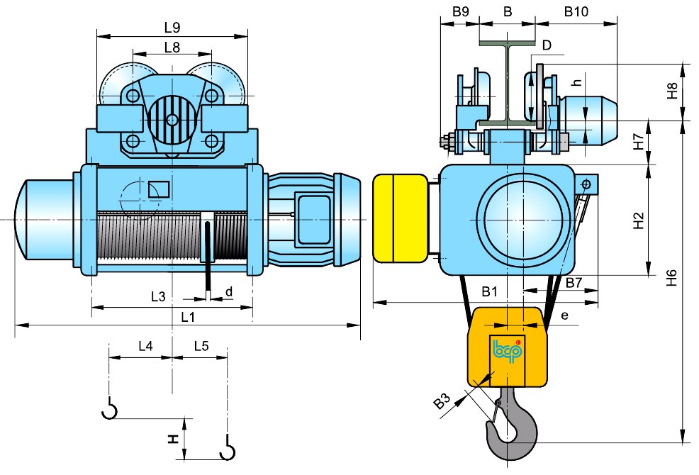 Electric hoists are mounted (suspended) on a monorail track made of a special I-beam of the following types: 24 m, 30 m, 36 m and 45 m according to GOST 19425-74. Hoists can be used as an independent lifting mechanism or as part of a single-girder crane. There are several modifications of hoists, differing in the design of the body: round, - type 13 t / t and rectangular, - type mh / mhl.