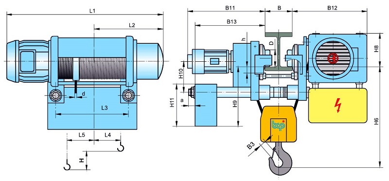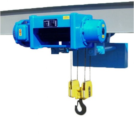 When ordering a hoist, the consumer can choose the following design options: with a wired remote control or radio remote control; various lifting and moving speeds, including several speeds; block and tackle multiplicity 1/1; 2/2; 2/1; 4/4; 4/1, etc. Electric suspended hoists with a lifting capacity from 1.0 to 16.0 tons are mounted (suspended) on a monorail track made of a special I-beam of the following types: 24 m, 30 m, 36 m and 45 m according to GOST 19425-74. The hoist can be used as an independent lifting mechanism or as part of a single-girder crane.
