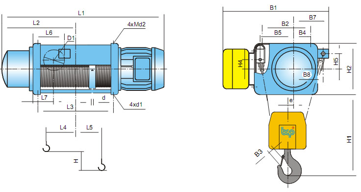 When ordering a hoist, the consumer can choose the following design options: mounting on paws or pins. Various lifting speeds from 1 m / min to 16 m / min, including several at the same time. Different multiplicity of the block and tackle 1/1; 2/2; 2/1; 4/2; 4/1, etc. supply voltage and control methods: wired or wireless.