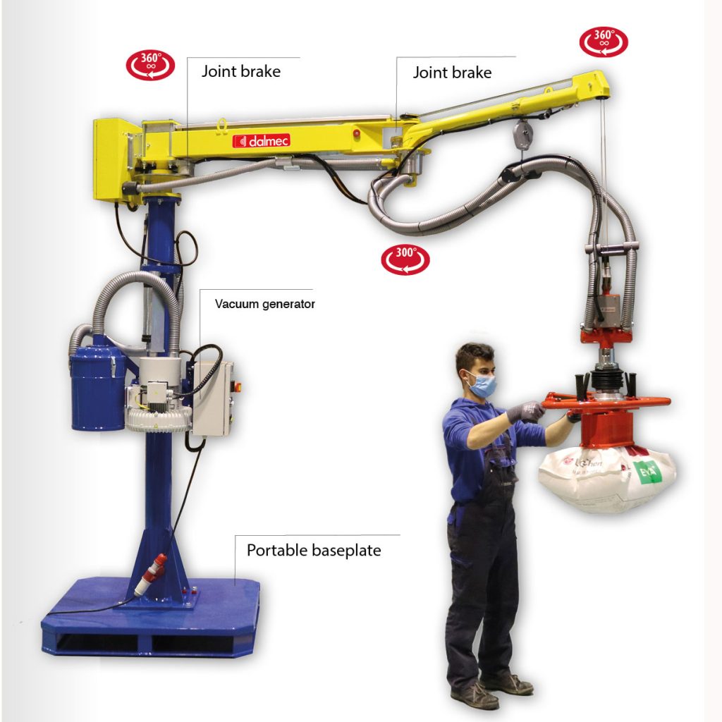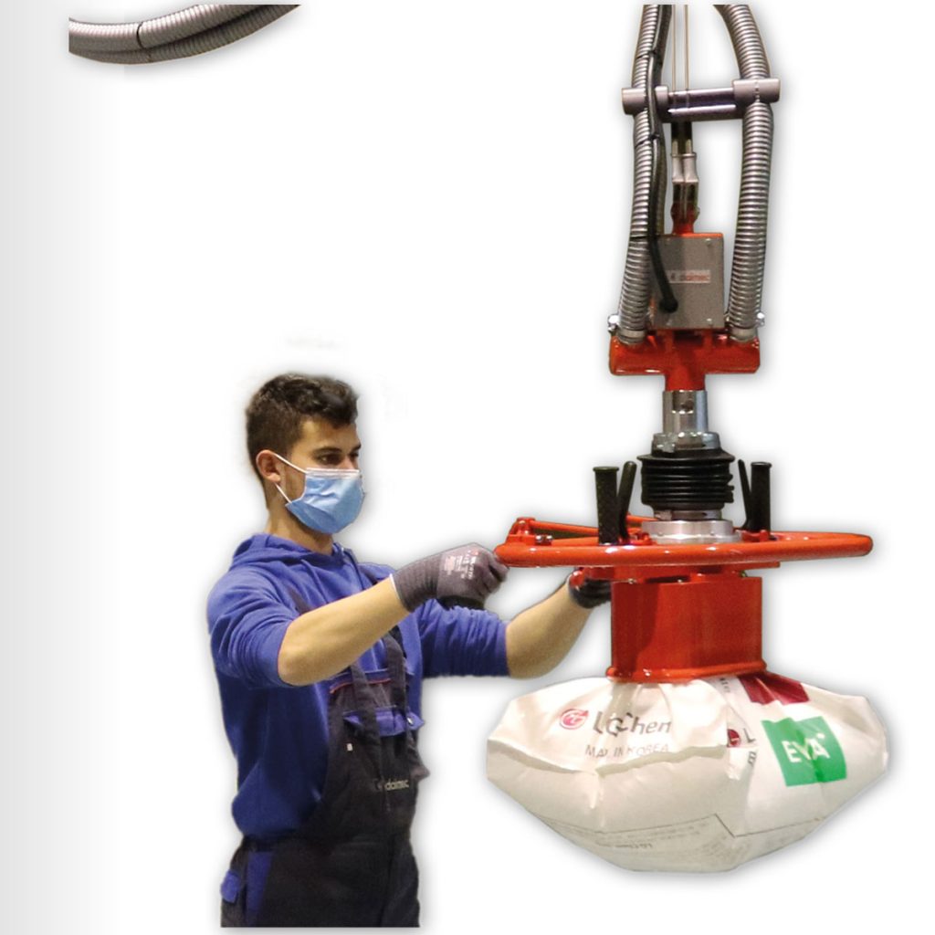 Манипулятор POSIFIL, оснащенный электротурбинным вакуумным насосом, позволяет обрабатывать бумажные и пластиковые пакеты, картонные коробки, тюки с резиной, бочки и т. д., используя стандартные или изготовленные на заказ присоски в зависимости от области применения.