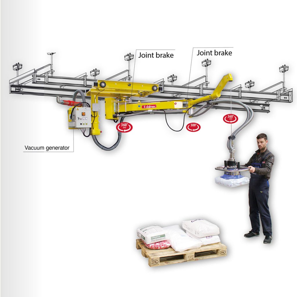 Эта новая система вакуумной интеграции Posifil обеспечивает исключительные эргономические преимущества при работе с пакетами в условиях низких потолков, позволяя оператору свободно использовать манипулятор в доступном рабочем пространстве.