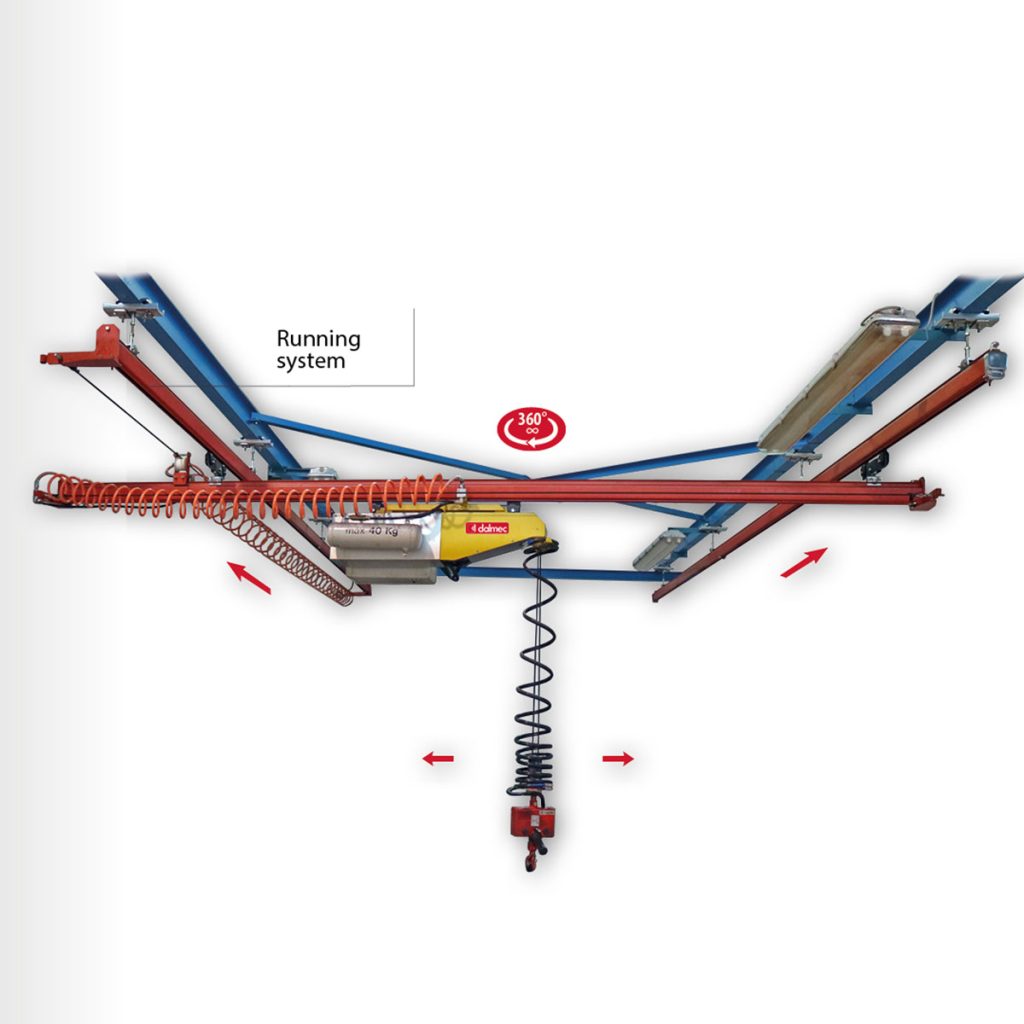 Пневматический манипулятор поставляется на подвижной каретке для перемещения по подвесному рельсовому пути.