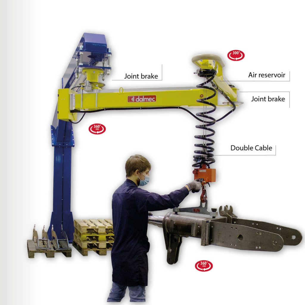 Maнипулятор Posifil, оборудованный двойной шарнирной стрелой. Устройство для захвата соединено с узлом уравновешивания с помощью пары стальных стальных тросиков.