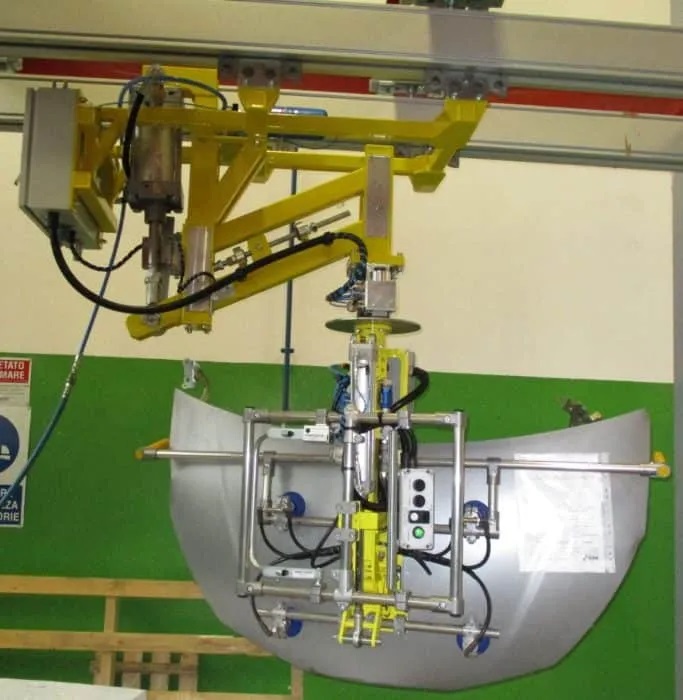 - Safety devices: in case of pressure failure a safety devices retains the grip on the load, and the tooling descends slowly till the floor. Special brakes keep the arm and gripping tool still when not used