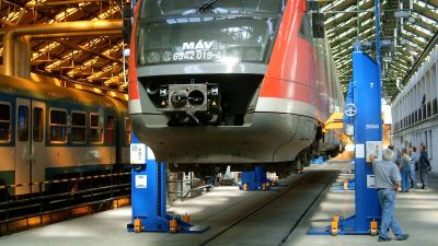 The iron frame of the lifting jacks is robust – support structure able to take eccentric load; the bearing of the lifting spindle and the lifting drive are placed on top of it. The lifting spindle with trapeze thread placed in the iron structure does the lifting. The spindles are protected against contamination by rubber harmonicas. For safe lifting a double lifting nut made of bronze alloy with good sliding qualities works on the spindle. The jacks can travel on fix- rail- or its own hydraulic carriages. Dimension range of railway lifting systems: Capacity per jack 6-25 t Number of lifting jacks 4-32 pcs Positioning indoor Feeding voltage 400V / 50Hz Lower arm position 250-350 mm Upper arm position 1800-2500 mm Lifting synchrony 3-20 mm (adjustable)