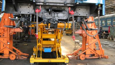 Functions: - lifting: train body vertical lift 800-1900 mm from top of rail - transport: horizontal movement of the train body at a height of 800 mm from top of rail - in load free state at a folded height of ca. 450 mm, transportable between the workstations when connected with a towing bar