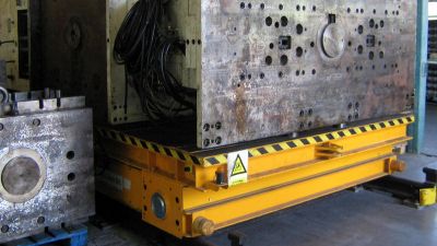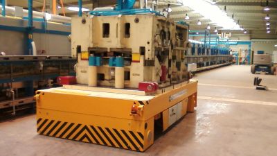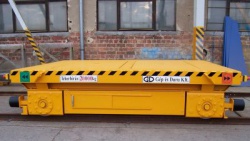 Below the carriage frame there are wheels able to travel on railway, but a version for travelling on smooth concrete with polyurethane or polyamide wheels is also available. At least two of the wheels for travelling on concrete are controlled. The loading platform will be designed according to the goods transported, smooth or ribbed steel panel, exchangeable wooden cover or equipped with other special supports. The frame has four lifting points per carriage on which the carriage can be lifted up and put onto another railway. The carriages can be towed or self propelled with battery. The application of the latter is easy because they do not need cable connection, neither for power supply nor for control. We reached this high grade of mobility through battery and radio remote control. |