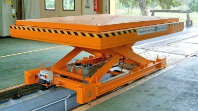 Мобільний гідравлічний підйомний стіл Являє собою низьку конструкцію, яка може вільно переміщатися звичайною залізницею. Він оснащений гідравлічним приводом для підйомного механізму. Мобільний гідравлічний підйомний стіл легко пересувається рейками залізниці внизу під вагоном або всім складом, якщо він піднятий на потрібну висоту. Силові блоки або інші деталі, розміщені під днищем залізничного поїзда або вагона, можуть бути опущені на стіл, а потім на мобільному гідравлічному столі переміщені для ремонту.