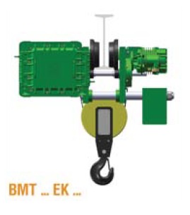 With monorail trolleyBMT-EK (reduced building height)Load capacity: 400 - 16000 kg Special versions - up to 20000 kg Pulley system: 1/1; 2/1; 4/1; Special versions - 4/2 Lifting height: 4.5 - 60 m Lifting speed: 1 - 20 m/min (at micro speed at 1:4 ratio) Movement speed: 8; 10; 12; 20; 12/4; 15/5; 20/6; 32/10 m/min |