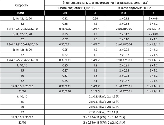 • Швидкість підйому: основна/мікро 8/2 м/хв, (поліспаст 2/1), основна/мікро 4/1 м/хв, (поліспаст 4/1)