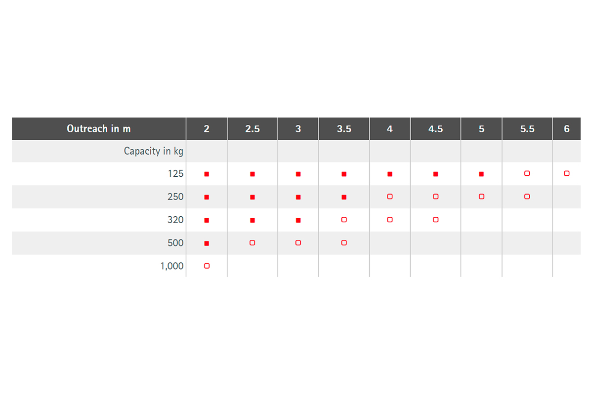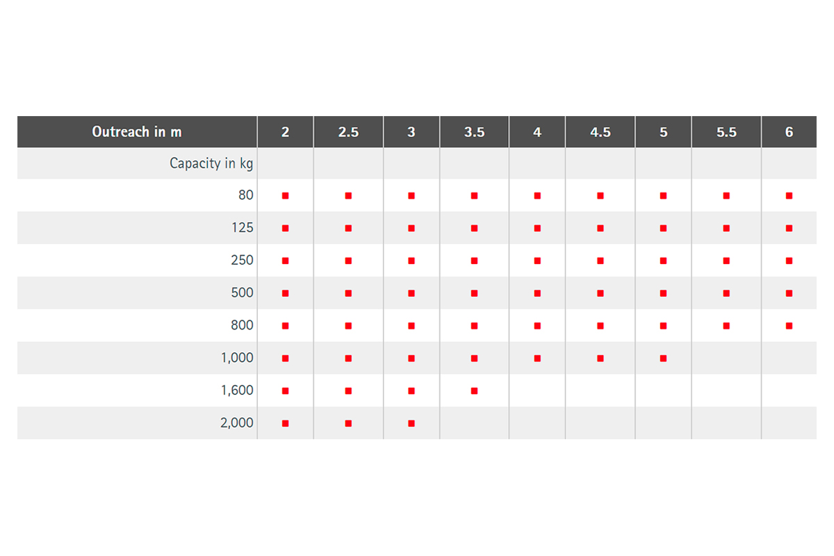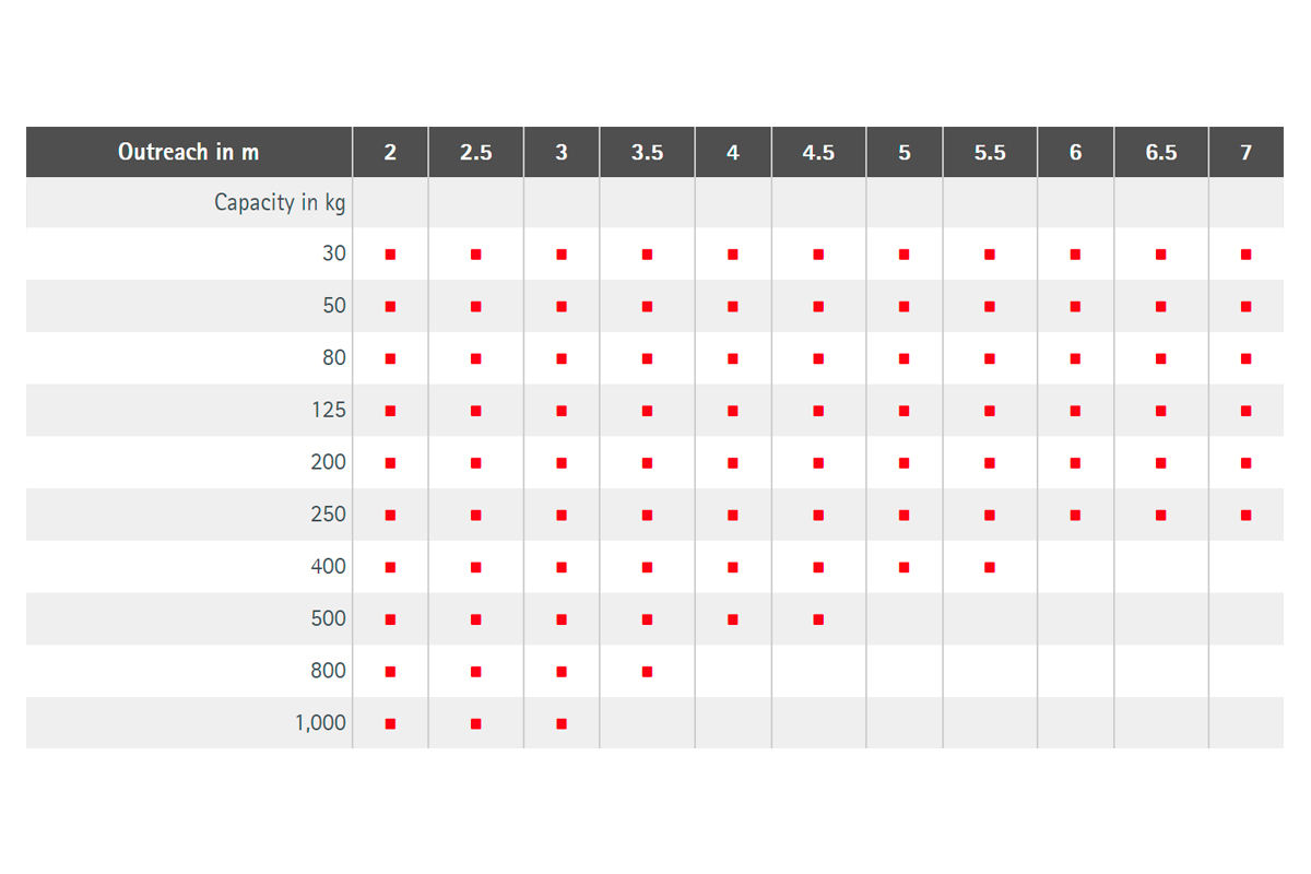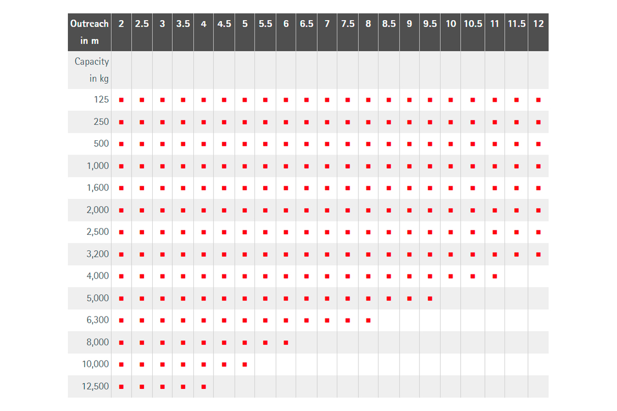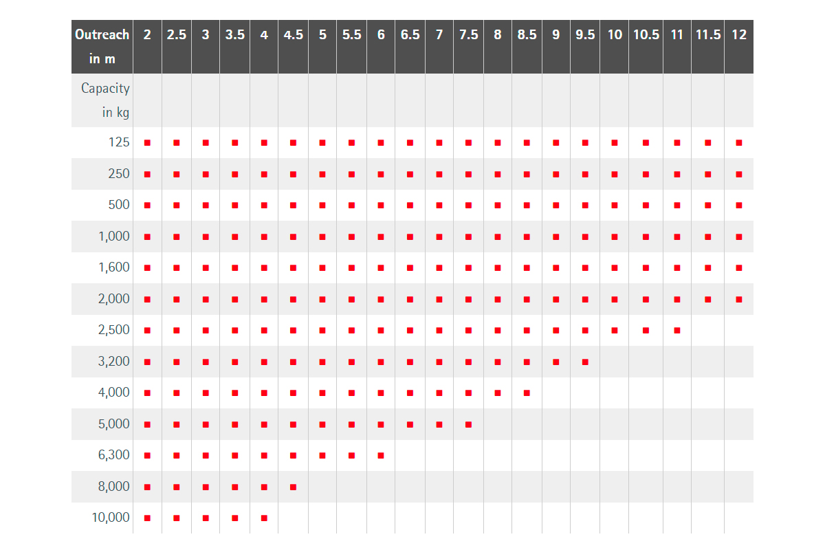 Поворотные стреловые краны демонстрируют свою универсальную применимость даже в самых сложных работах по транспортировке материалов. Их можно использовать в качестве магнитных кранов, кранов для электростанций, погрузочных кранов, специальных кранов на крупном карьерном оборудовании или в качестве кранов-роботов. У нас есть необходимый опыт и знания в области поворотных стреловых кранов. Уже достигнуты грузоподъемность до 100 тонн и вылет до 20 м.